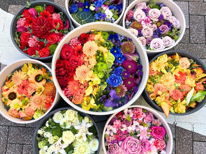 花手水とは……「花手水(はなちょうず)」は、神社やお寺の参拝前に手や身を清める手水舎にある手水鉢の中に花を浮かべたものです。感染症拡大時期に水で手や口を清める代わりに、手水鉢にお花を浮かべ、目で見ることで心を清めてもらおうと拡がりました。今では花手水の文化はすっかり浸透し、神社やお寺に留まらず、街中や商店の軒先などに設置して、行き交う人々に楽しんでもらおうと「おもてなし」の新しいスタイルにもなっています。