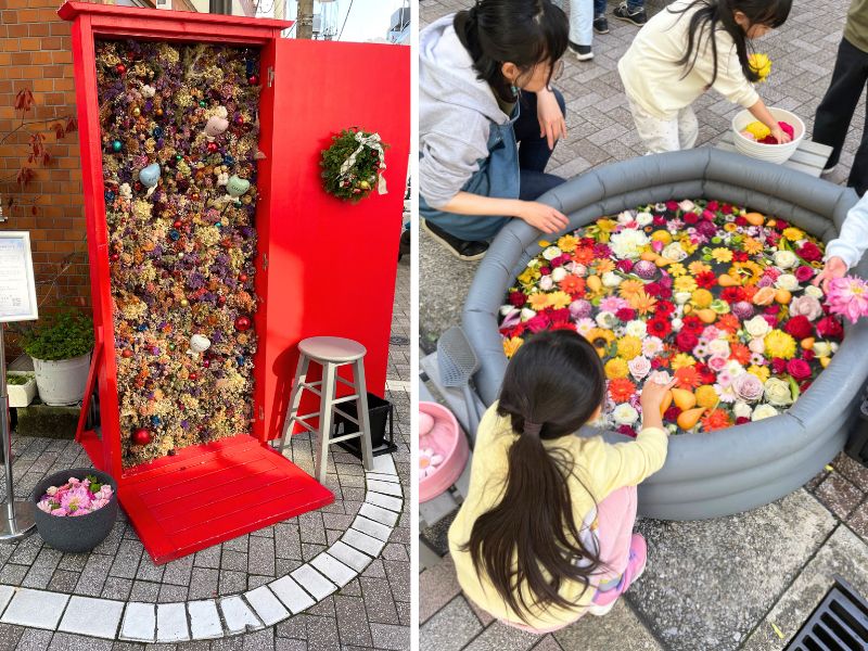 今回用いたお花の多くは、お花自体はきれいでも、茎が短い曲がっているなどの理由で規格外となった花です。弊社では「プラスフラワー」と名付け、日頃からその活用に取り組んでいます。手水鉢に飾られたお花を観賞するだけでなく、ご自身で組み合わせを楽しめるよう、マイ花手水づくりも無料体験していただきました。小さなお子様から大人のかたまで、それぞれマイ花手水を作って写真に残すというものです。また、ドライ加工をしたプラスフラワーがぎっしり詰まった赤い扉の展示も行い、フォトスポットとして多くの方に楽しんでいただきました。イベント終了時には、ディスプレイと体験会で使用した生花の無料頒布も行い、多くのかたが存分にお花に触れる機会となりました。